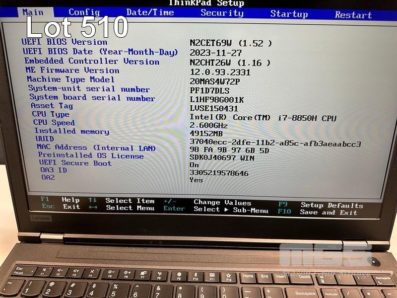 LAPTOP, LENOVO THINKPAD P52 MOBILE WORKSTATION, TYPE 20MA, CORE i7 8850H (8TH GEN) @ 2.6GHz, 48GB DDR4 RAM, 512GB NVMe M.2 SSD, 15.6" WIDESCREEN (1920x1080), 4GB NVIDIA QUADRO P2000 VIDEO, Wi-Fi, BLUETOOTH, WINDOWS 11 PRO INSTALLED & POWER SUPPLY S/N:PF1D7DLS