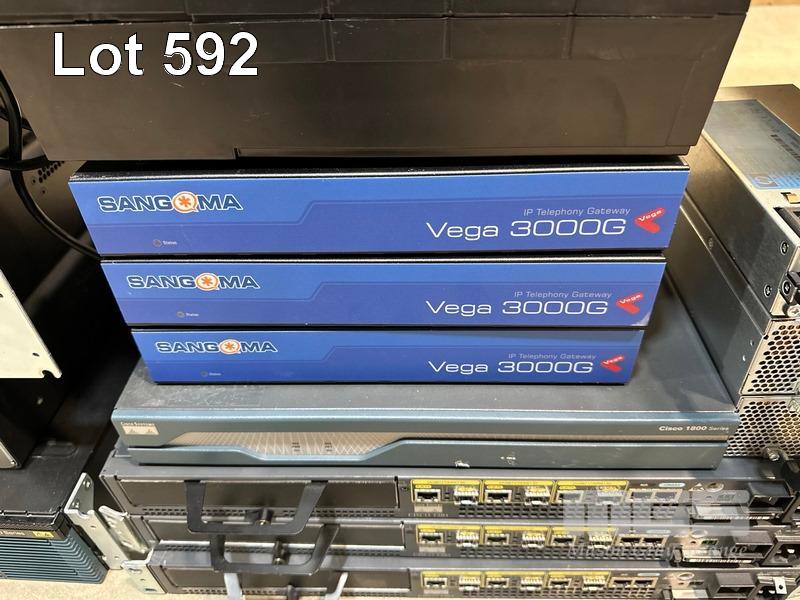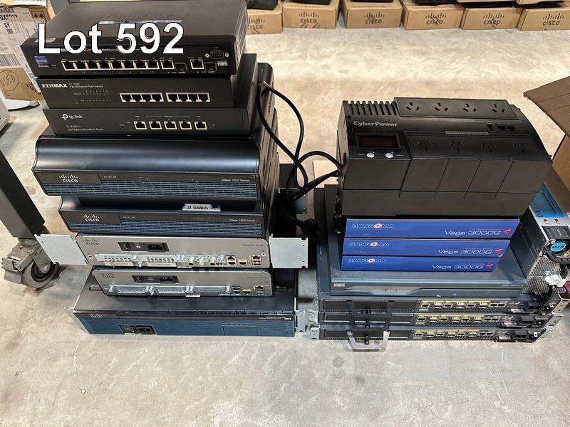 1 x LINKSYS SRW208P 8-PORT SWITCH, 1 x EDIMAX ES-1008P 8-PORT SWITCH, 1 x TP-LINK TL-R480T+ LOAD BALANCE BROADBAND ROUTER, 4 x CISCO 1900 SERIES ROUTERS, 1 x CISCO 2900 SERIES ROUTER, 3 x SANGMA VEGA 3000G IP TELEPHONY GATEWAY 1 x CYPERPOWER UPS 1 x CISCO 1800 SERIES ROUTER, 3 x CISCO 7301 ROUTERS, 3 x HP SERVER POWER SUPPLIES
