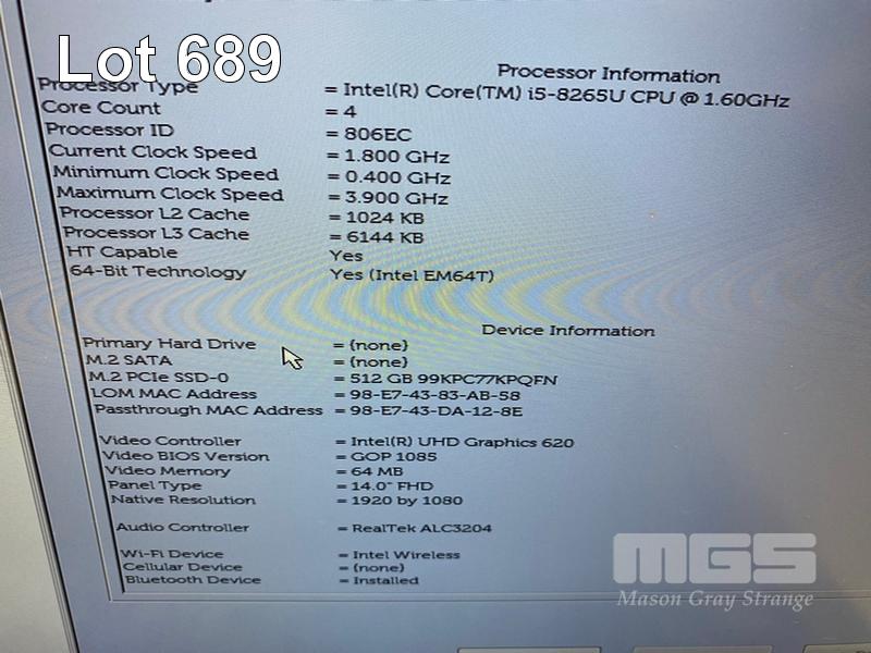 LAPTOP, DELL LATITUDE 5400, CORE i5 8265U (8TH GEN) @ 1.6GHz, 8GB DDR4 RAM, 512GB NVMe M.2 SSD, 14" WIDESCREEN (1920x1080), INTEL UHD GRAPHICS 620, Wi-Fi, BLUETOOTH, WINDOWS 11 HOME INSTALLED (NO POWER SUPPLY) (NOTE: MARKS & SPOTS ON SCREEN) S/N:1XD2ZY2