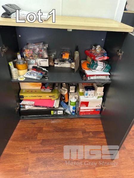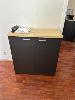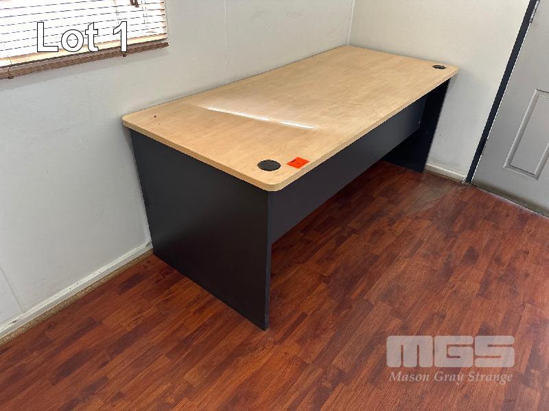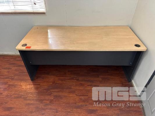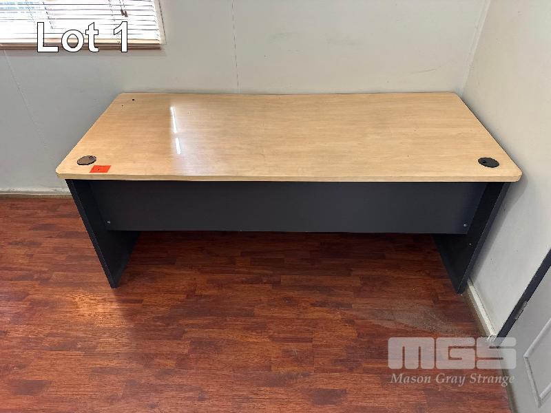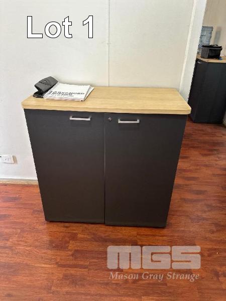 DESK, TIMBER LAMINATE, PINE & CHARCOAL, 1800 x 800mm & 2 x 2 DOOR MATCHING CUPBOARDS, 900 x 450 x 900mm(H)