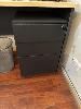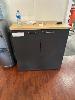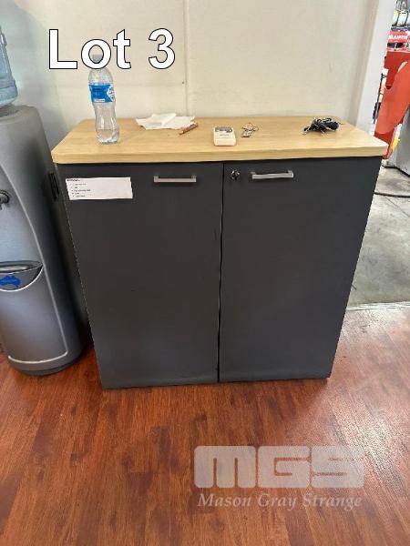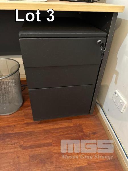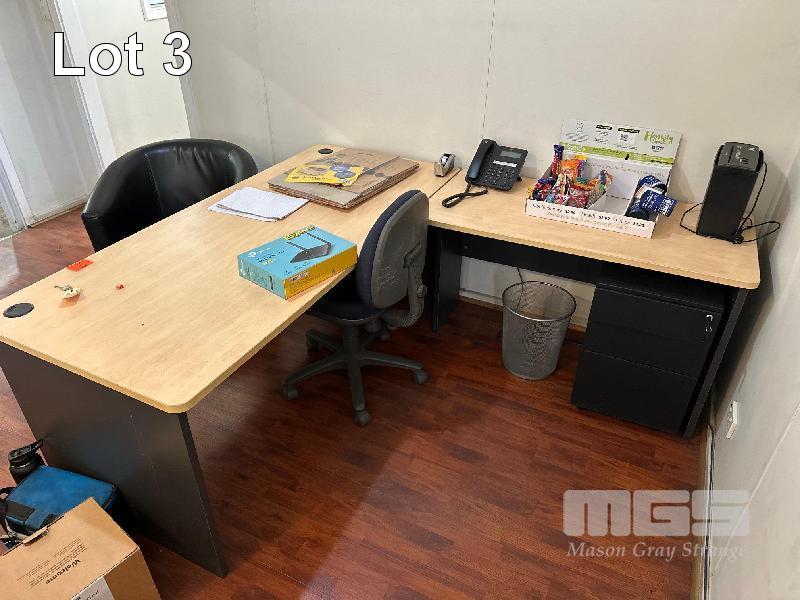 DESK, TIMBER LAMINATE, PINE & CHARCOAL, 1800 x 2000mm WITH RETURN, UNDERDESK MOBILE & GAS LIFT CHAIR