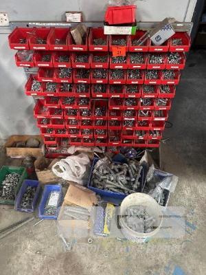 84 BIN RACK & CONTENTS LARGE QUANTITY NUTS, BOLTS & WASHERS, PLUS LOOSE TUBS & GALV BOLTS