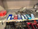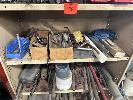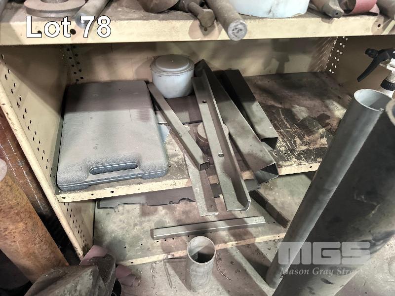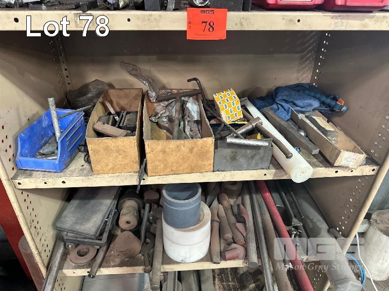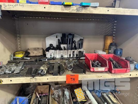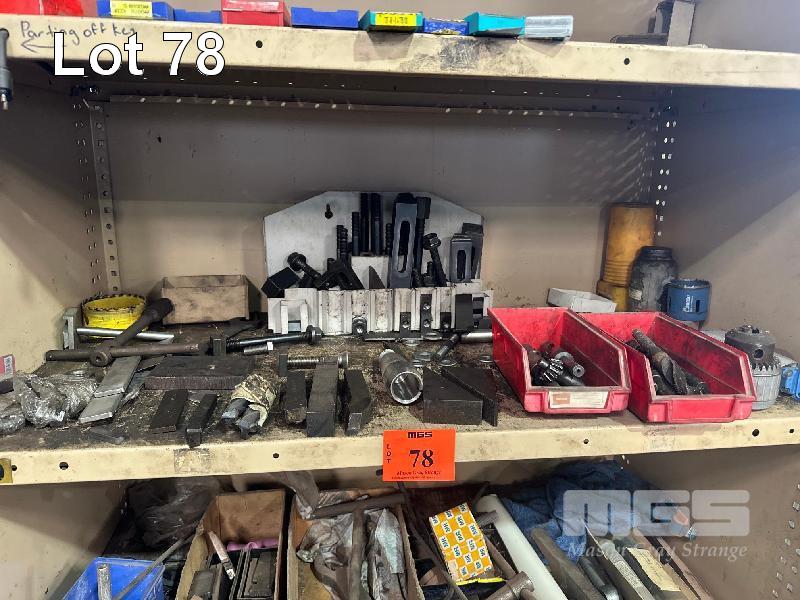 STEEL SHELF UNIT & CONTENTS, 7 TIER, CLAMP KIT, LATHE TOOLS, DRILL BITS & OFFCUT STEEL BAR