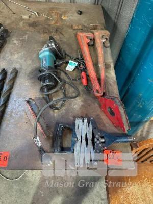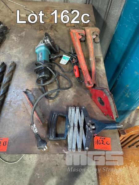 MAKITA ANGLE GRINDER, 125mm, 2 x MAGNETIC SQUARES, 2 x RIGID PIPE WRENCHES, 24", SOLDERING IRON & POP RIVETER