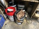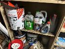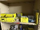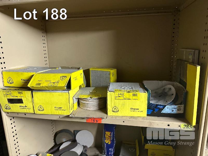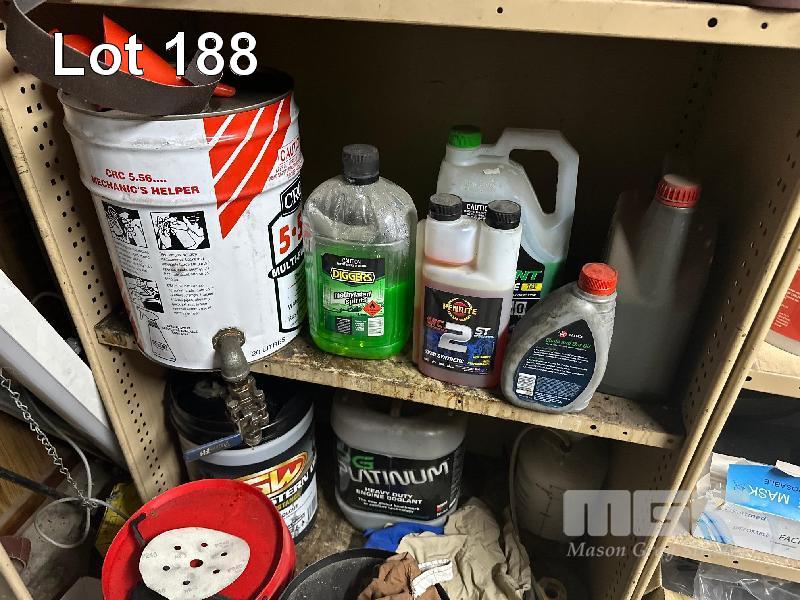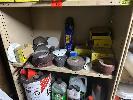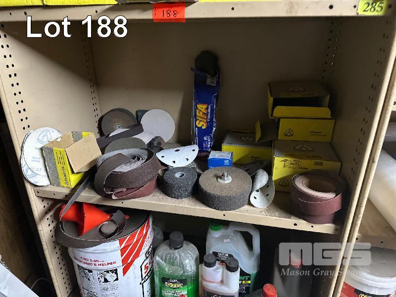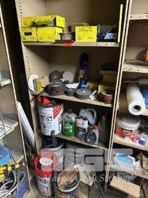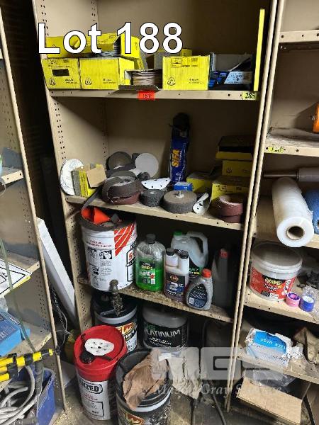2 x STEEL SHELF UNITS & CONTENTS SAFETY SIGNS, SANDING DISCS, EMERY TAPE, OIL, HOSE, ETC