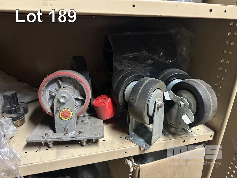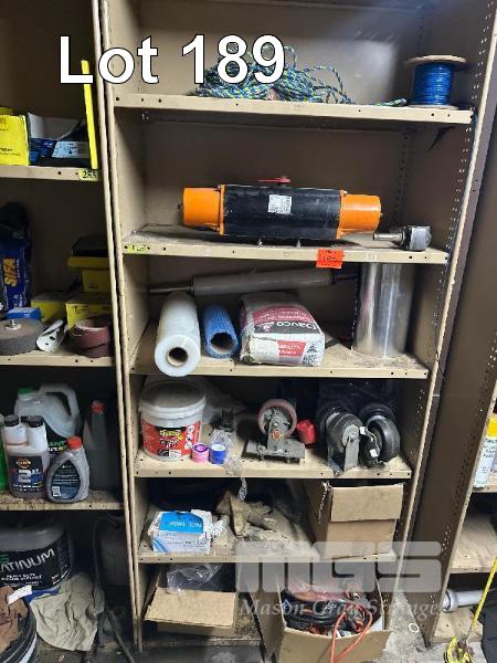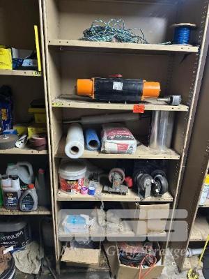 STEEL SHELF UNIT & CONTENTS CASTOR WHEELS, 415V PLUGS, ROPE, VALVE CONTROL WRAP
