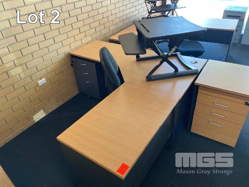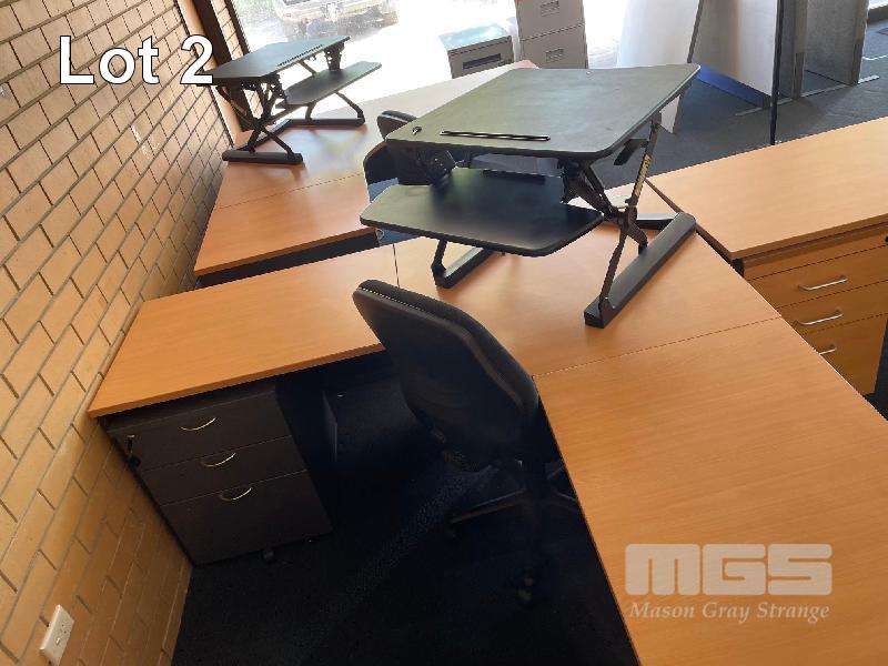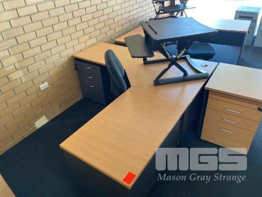 DESK, L-SHAPE, BEECH STORM LAMINATE, (CNR) 1800 x 1800mm WITH 3 DRAWER MOBILE, GAS LIFT OFFICE CHAIR & PC DESK RISER