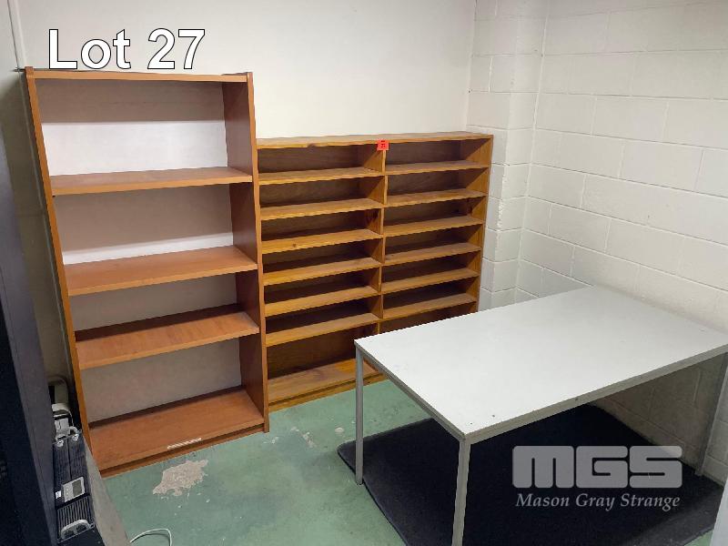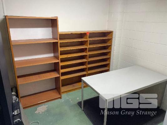 2 x ASSORTED SHELF UNITS & MEETING TABLE GREY LAMINATE, 160cm