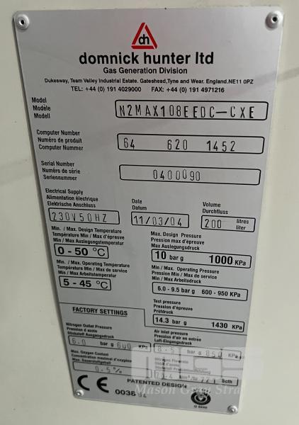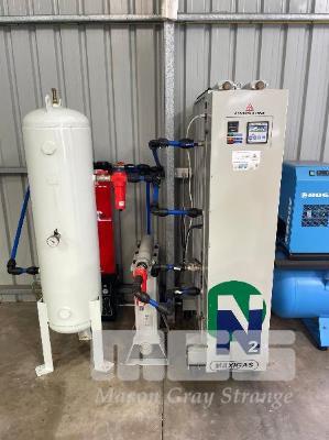 MAXIGAS NITROGEN GENERATOR WITH AIR DRYER, OIL SEPARATOR & BUFFER TANK, NITROGEN GENERATOR: MOD: N2MAX108EEDC-CXE, SERIAL: 0400090, DOM: 2004 AIR DRYER: CODE: DME025, TYPE: 61 620 4000, SERIAL: 51595A, DOM: 2004 BUYERS PREMIUM: 11% 240V 10AMP PLUG ON SKID BASE NOTE: LOCATED AT SELLICKS HILL, SA, INSPECTION BY APPOINTMENT ONLY