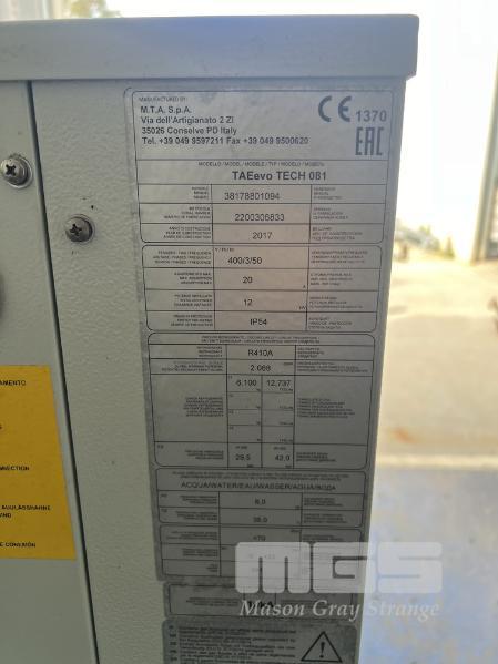 M.T.A WATER CHILLER, MOD: TAE evo TECH 081, DOM: 2017, SERIAL: 2200306833, APPROX: 80hrs TOTAL, WITH USER MANUAL 3 PHASE 415V NOTE: LOCATED AT SELLICKS HILL, SA, INSPECTION BY APPOINTMENT ONLY BUYERS PREMIUM: 11%