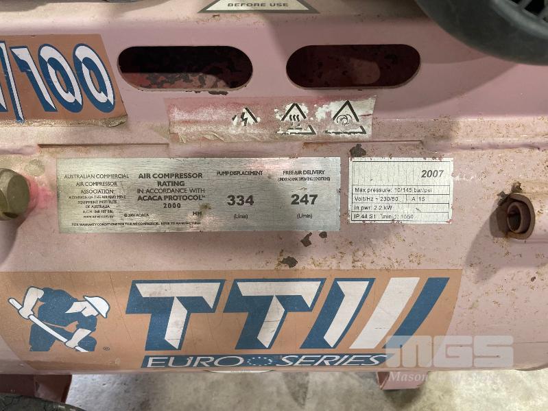 TTI AIRCOMPRESSOR, EURO SERIES, DOM: 2007, MAX: 10 BAR, 247L/min, 240V 10AMP PLUG NOTE: LOCATED AT SELLICKS HILL, SA, INSPECTION BY APPOINTMENT ONLY