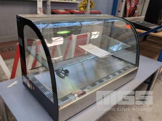 COMMERCIAL COUNTER TOP HEATED DISPLAY. CURVED GLASS. 930 X 500 X 550 MM (W D H). 240V. ** NO DOORS **
