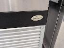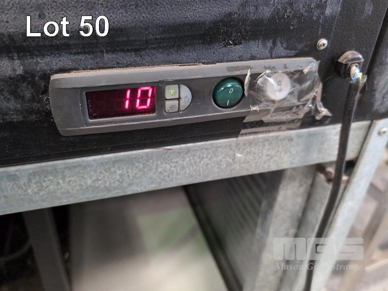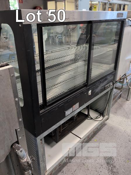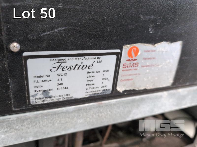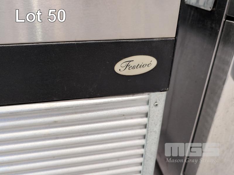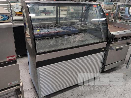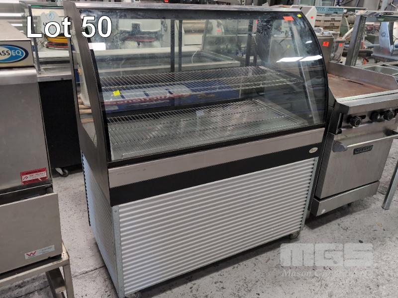 REFRIGRATED CURVED GLASS DISPLAY CABINET. MOBILE WITH WIRE SHELVES & CORRUGATED TIN PANELS. FESTIVE MODEL WC12. 240V.