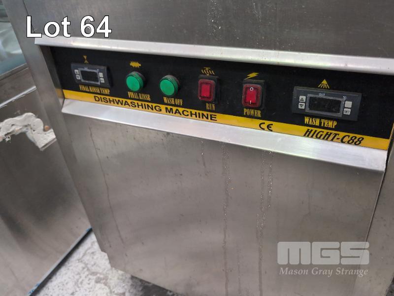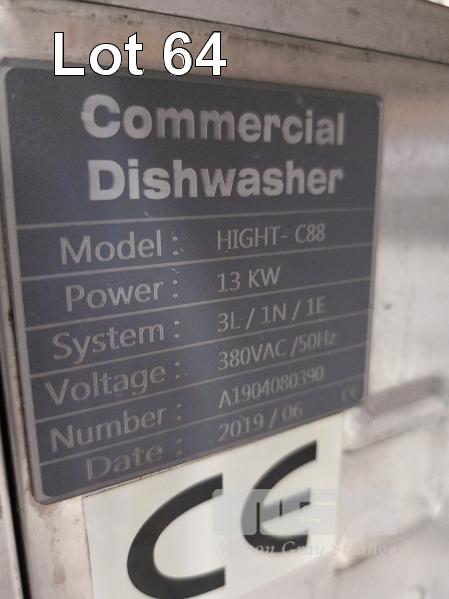 1 X PASS THRU DISHWASHER. MOD: HIGHT-C88 WITH 1 X BASKET/RACK. 650 X 860 X 1,500 - 1,900 MM (W D H). 415V. 1 X RHS STAINLESS STEEL BENCH WITH UNDERBENCH AND SPLASHBACK. 1,100 X 760 X 920 MM (W D H).