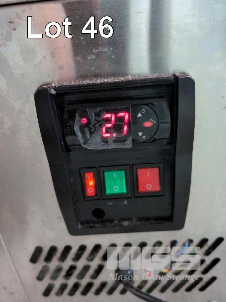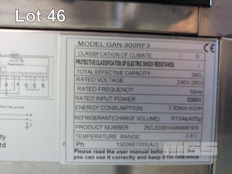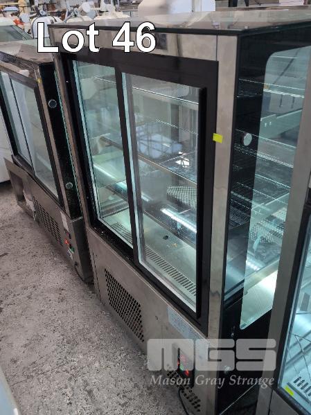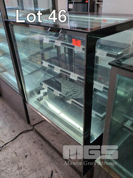 REFRIGERATED RECTANGULAR CAKE DISPLAY CABINET. ILLUMINATED, MOBILE WITH GLASS SHELVES. MODEL GAN-900RF3. 900 X 740 X 1,330 MM (W D H). 240V.