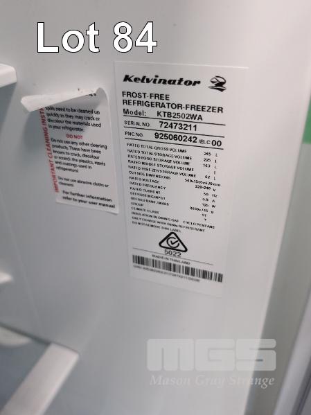 FROST FREE FRIDGE/FREEZER, KELVINATOR MOD: KTB2502WA 245 LITRE, 2 DOOR 240V