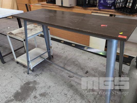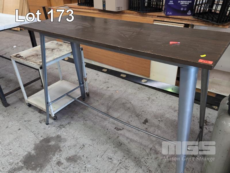 1 X DRY BAR. TIMBER TOP ON FOLDED METAL FRAME. 1,520 X 600 X 1,080 MM (W D H). 1 X MOBILE 2-SHELF UNIT. 610 X 510 X 700 MM (W D H).