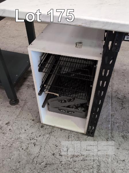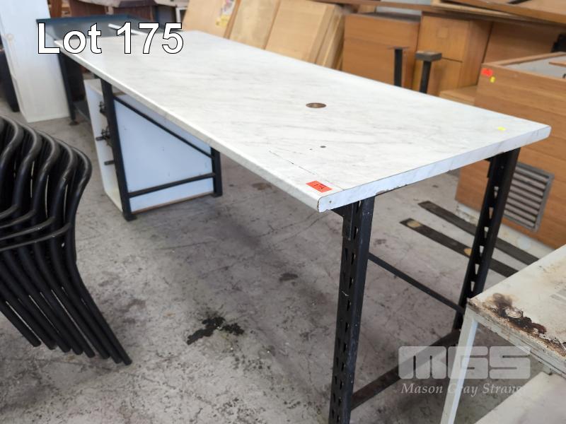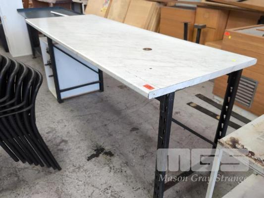 OUTDOOR SERVING TABLE. FABRICATED. LAMINATED TOP WITH SIDE UNIT AND 4 X GLASS TRAYS. 2,400 X 900 X 970 MM (W D H).