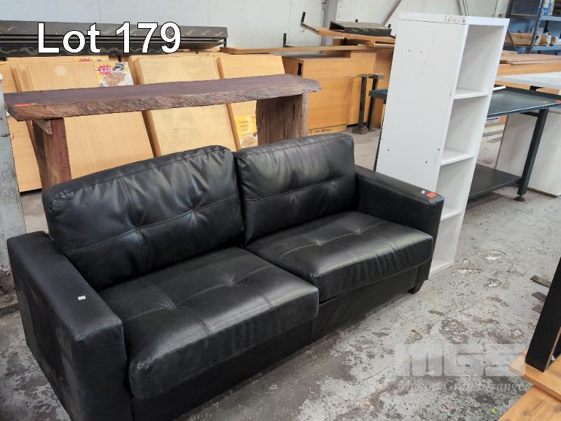 2.5 SEATER SQUARE ARM LOUNGE. BLACK LEATHER LOOK WITH 4-SHELF UNIT.