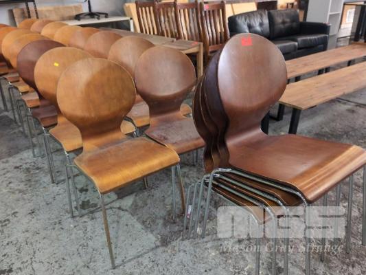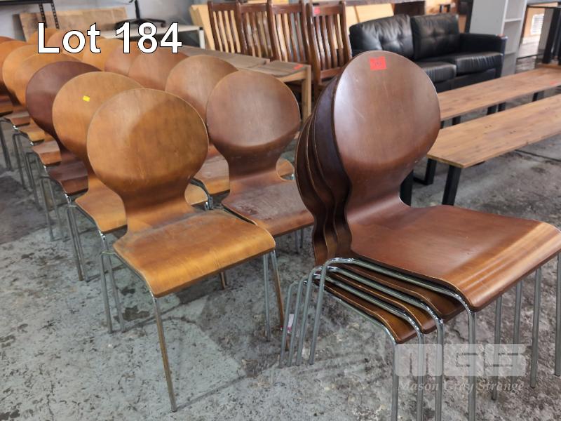19 X RETRO STACKABLE BENTWOOD CHAIRS. POLISHED STEEL LEGS.
