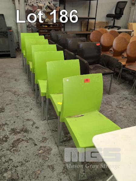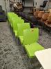7 X PVC STACKING CHAIRS IN LIME GREEN. GREY STEEL LEGS.