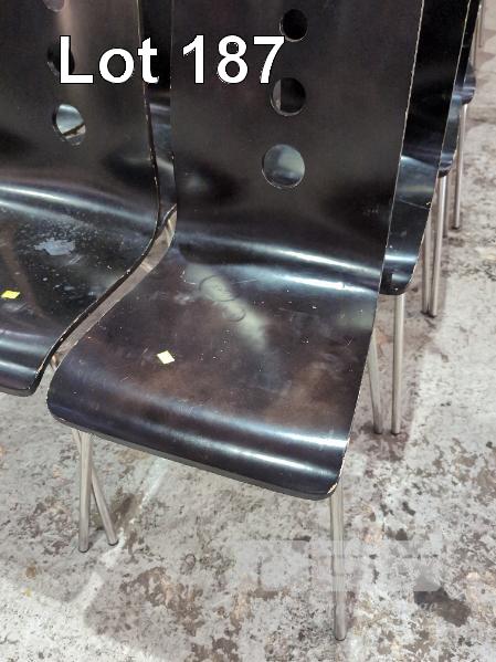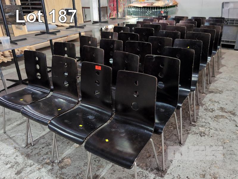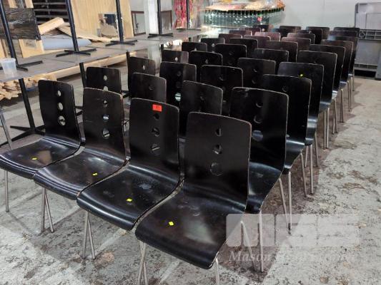 40 X STACKABLE RETRO BENTWOOD CHAIRS IN BLACK. POLISHED STEEL LEGS.