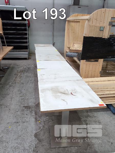 7 X SQUARE CAFE TABLES. WHITE LAMINATE TOPS ON HEAVY POLISHED STEEL SQUARE TUBE BASE. ** EDGE STRIPS MISSING ON MOST **