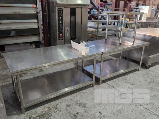2 X COMMERCIAL KITCHEN STAINLESS STEEL PREP BENCHES WITH UNDER SHELF. WITH 200 MM FABRICATED FOOT EXTEDERS. 1,500 MM X 800 MM (W D H).