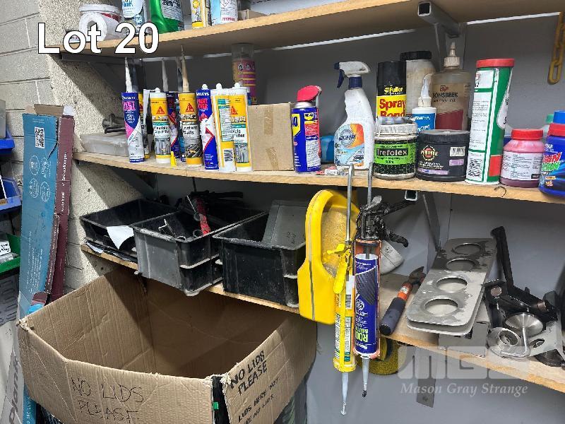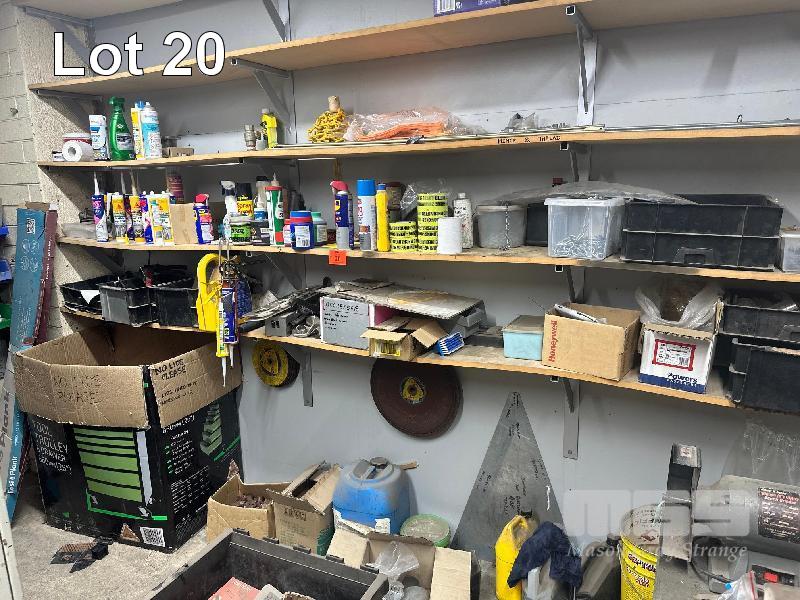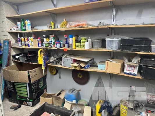 WALL SHELF CONTENTS INCLUDING CHAIN, HARDWARE, LUBRICANTS, THREADED ROD, MASTICS, ETC
