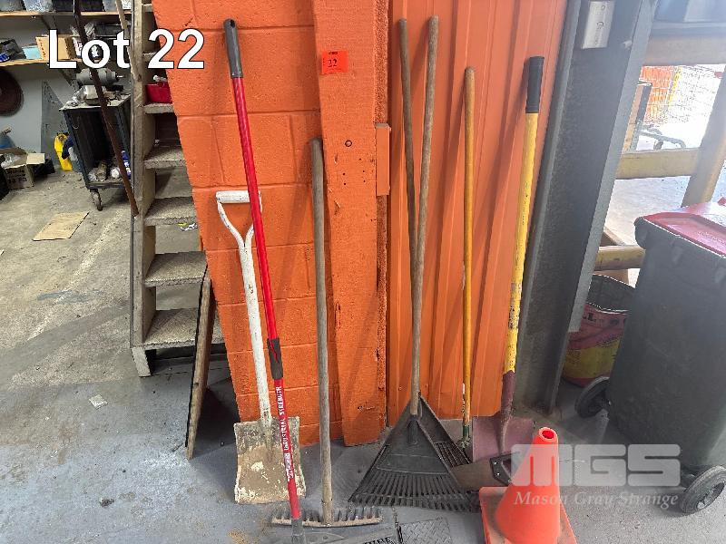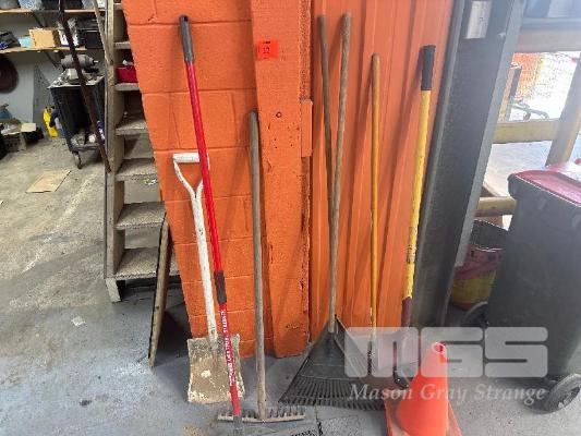 ASSORTED GARDEN TOOLS, INCLUDING SHOVELS, POST HOLE DIGGER, HOE, ETC