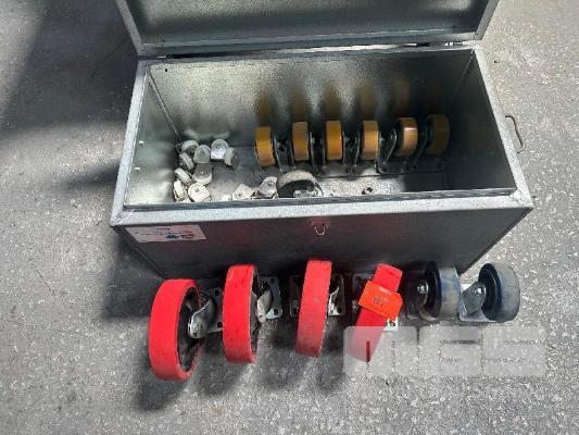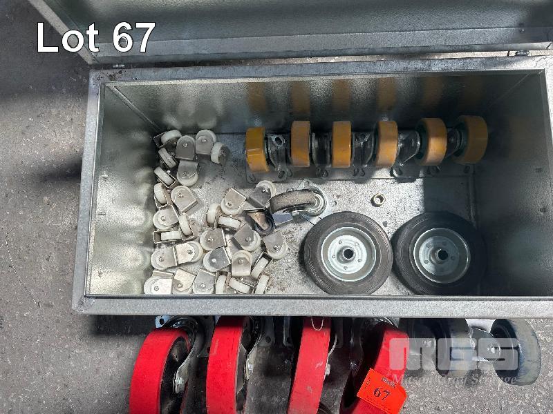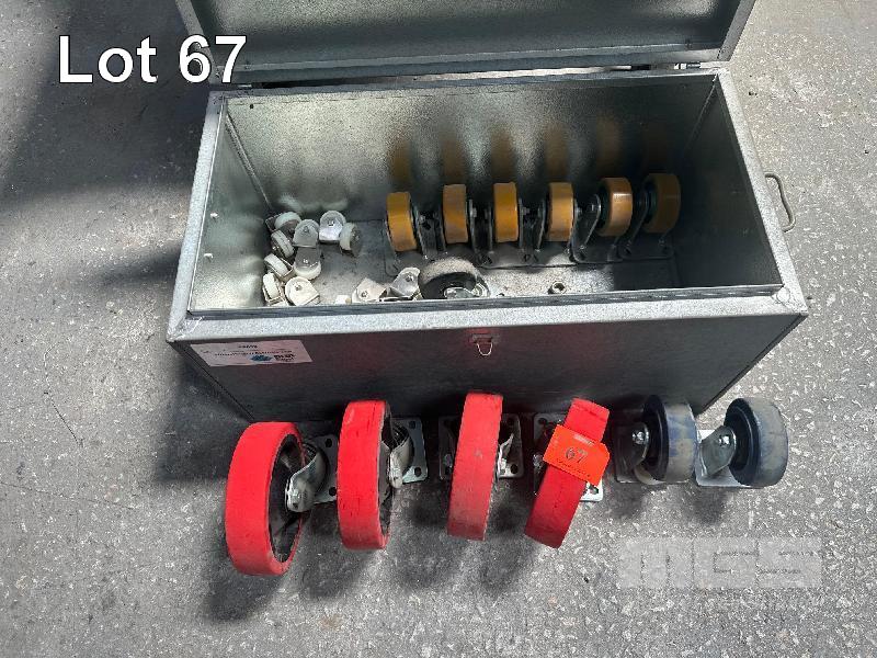 LARGE QUANTITY CASTOR WHEELS, 30 @ 45mm 6 @ 100mm 2 @ 125mm 4 @ 200mm & TOOL BOX