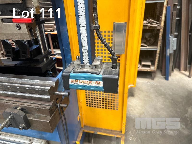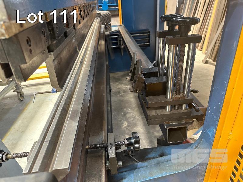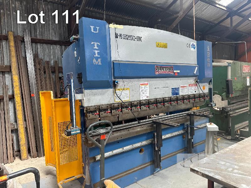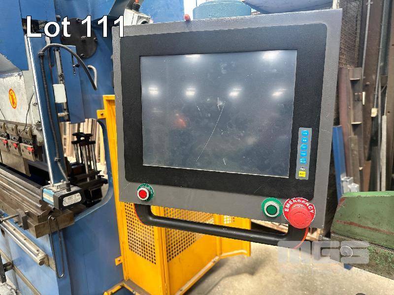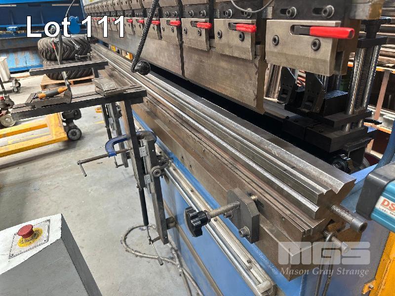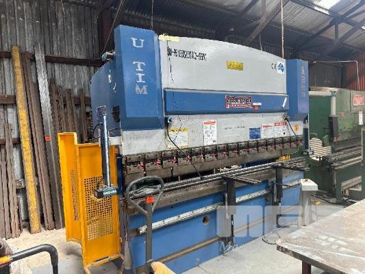 STEEL MASTER HYDRAULIC PRESS BRAKE MOD: 135/3200 CNC2 DOM: 2018 135T/ 3200mm TOOL DECK INCLUDES, 4 WAY TOOL BLOCK & ASSORTED BLADES DSP LASER-TX SAFETY BEAMS, PEDAL CONTROL WITH E/S, POWERED BACK GAUGE ON BALL SCREW THREADS, REAR SAFETY BEAMS