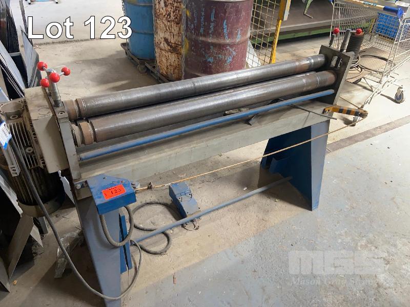 HAFCO POWERED SHEET METAL ROLLER MODEL: PR132 DOM: 2011 CAPACITY: 1200mm x 1.5mm WITH E/S SAFETY CABLE, PEDAL CONTROL & SWING POUT TOP ROLL