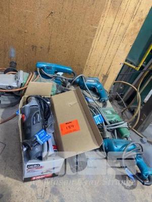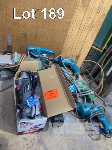 ASSORTED POWER TOOLS, HITACHI 9" DRILLS, OZITO GRINDER & MAKITA SANDER
