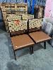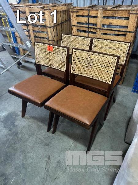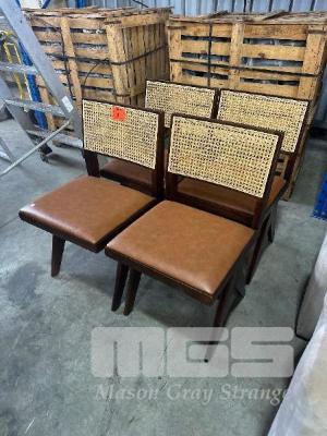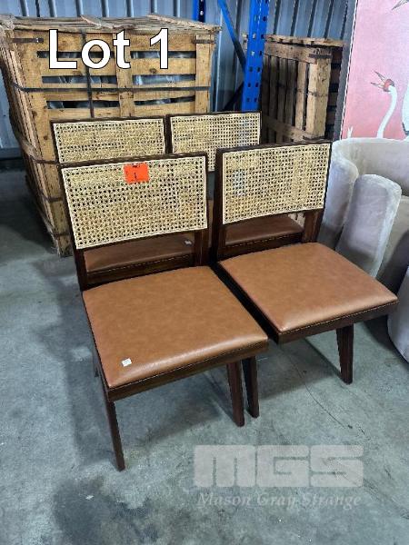 4 x RETRO DINING CHAIRS, VORSEN WICKER BACK, LEATHER SEAT, SOLID TIMBER