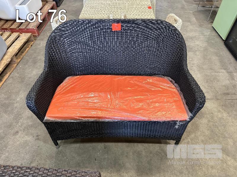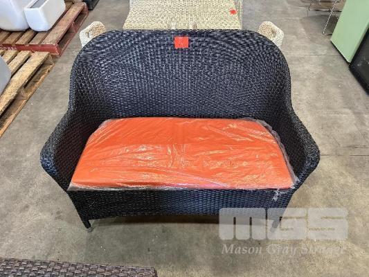 2 SEATER OUTDOOR CHAIR, BLACK WICKER STYLE PVC, ORANGE CUSHION