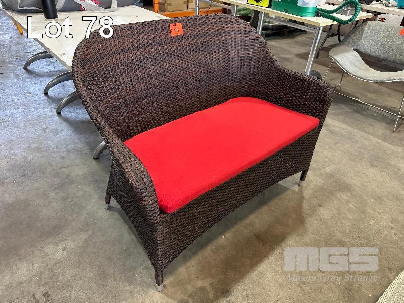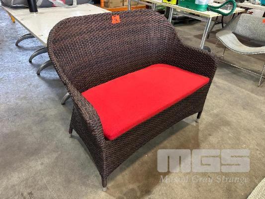 2 SEATER OUTDOOR CHAIR, BROWN WICKER STYLE PVC, RED CUSHION