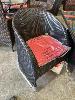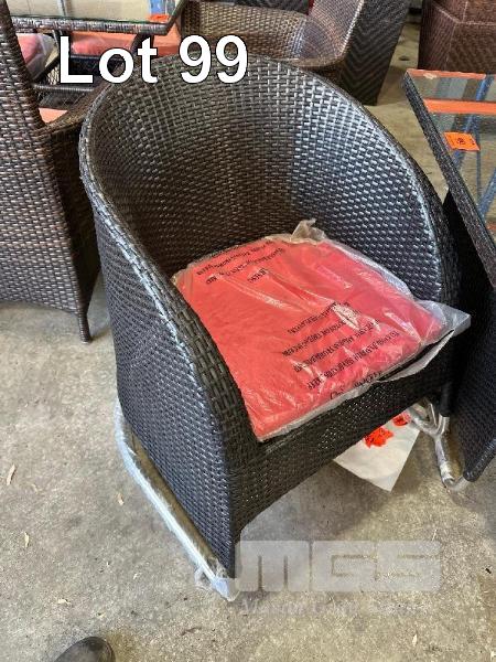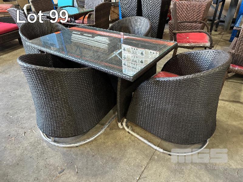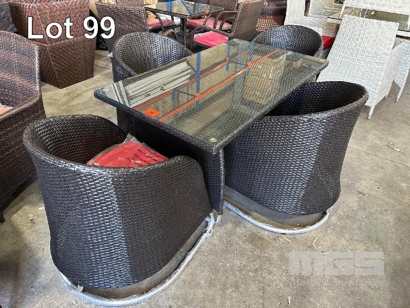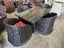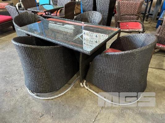4 SEAT OUTDOOR SETTING, BLACK/BROWN WICKER STYLE PVC, 1400 x 800mm, RED CUSHIONS, CHROME BEDS