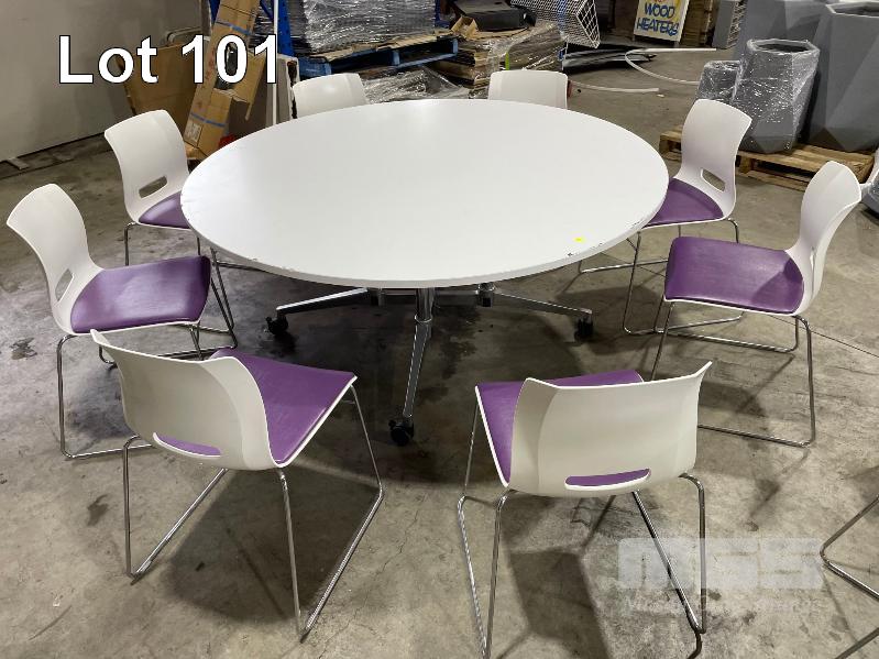 CIRCULAR TABLE, 1700mm (D), TIMBER LAMINATE, MOBILE WITH 8 x CHAIRS, WHITE/PURPLE