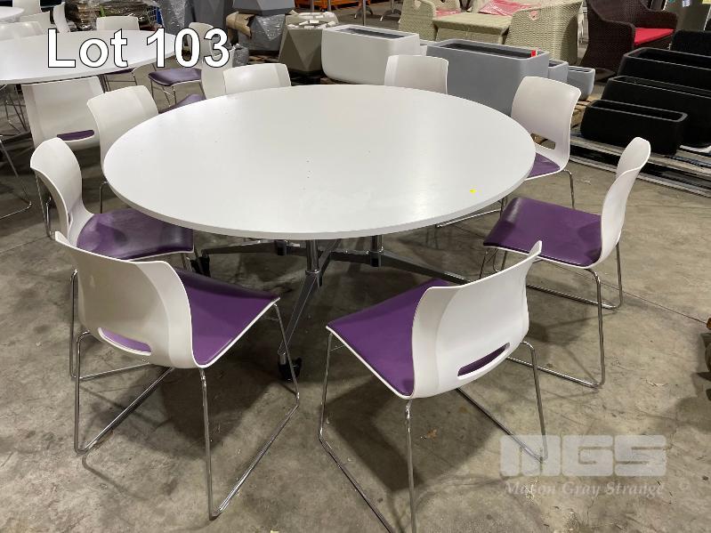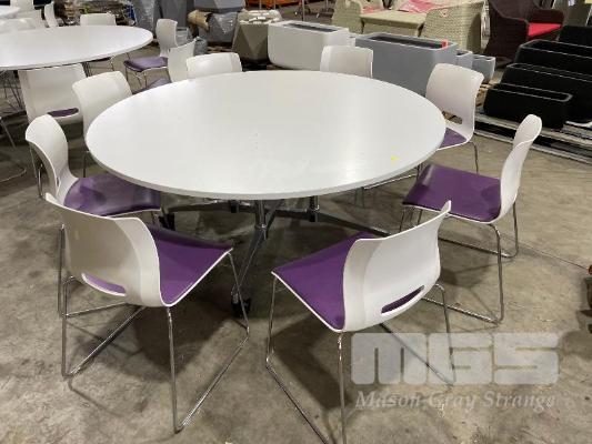 CIRCULAR TABLE, 1700mm (D), TIMBER LAMINATE, MOBILE WITH 8 x CHAIRS, WHITE/PURPLE