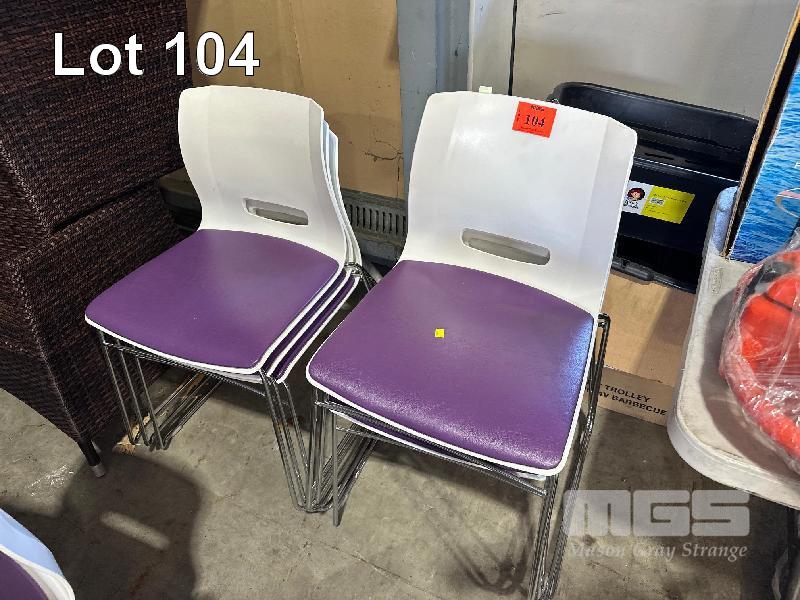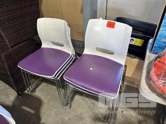 6 x CHAIRS, WHITE/PURPLE, CHROME LEGS, STACKABLE