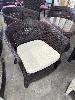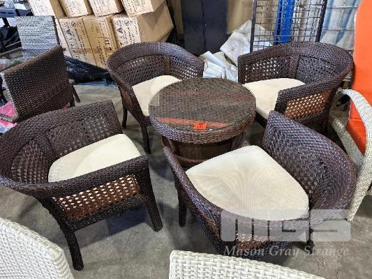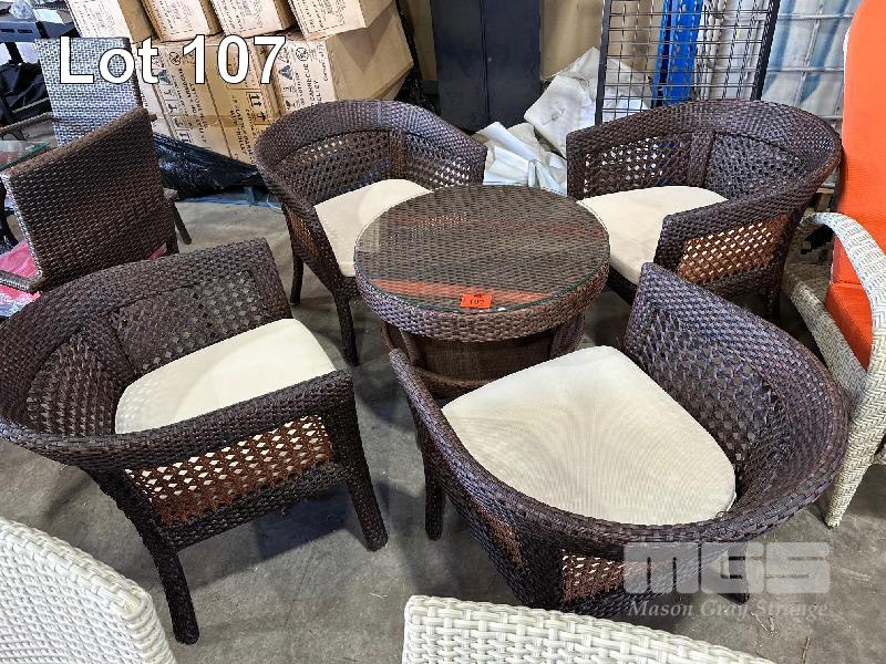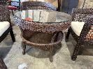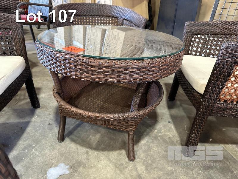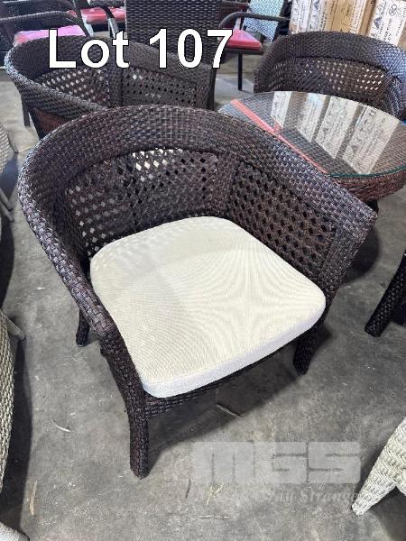 4 SEAT OUTDOOR SETTING, LIGHT & DARK BROWN WICKER STYLE PVC, GLASS TABLE: 700mm (D) OFF WHITE CUSHIONS