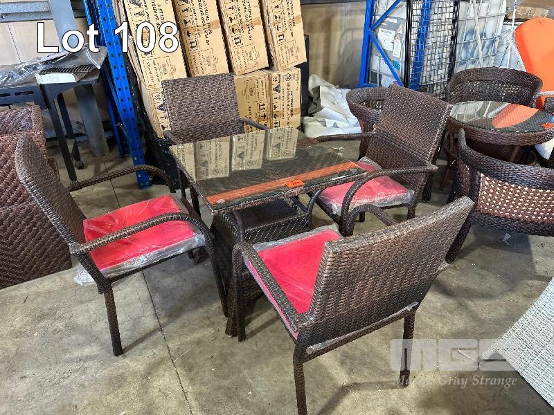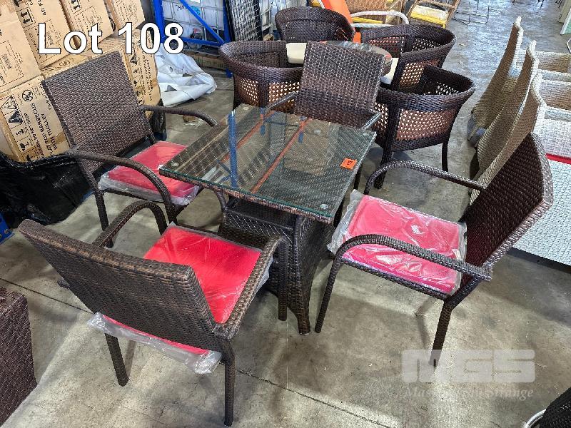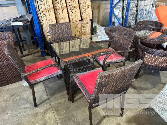 4 SEAT OUTDOOR SETTING, LIGHT & DARK BROWN WICKER STYLE PVC, GLASS TABLE: 700 x 700mm RED CUSHIONS