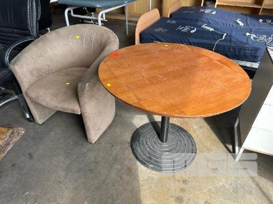 TUB CHAIR, BEIGE, POOR CONDITION & VISITORS TABLE, 900mm (D)