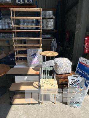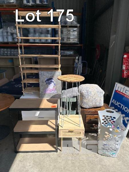 2 x SHELF UNITS, 3 & 9 TIER, 3 DRAWER STORAGE UNIT, CUTLERY TROLLEY. OTTOMAN, SINGLE DRAWER SIDE TABLE, 2 DRAWER SIDE TABLE, ETC