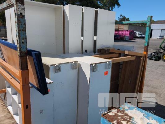 9 X ASSORTED MDF/ PARTICLE BOARD BOOKSHELVES. STORAGE UNIT AND 2 X SIDE TABLES. CONTENTS 1 X STILLAGE. STILLAGE NOT INCLUDED.