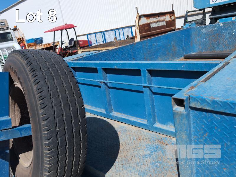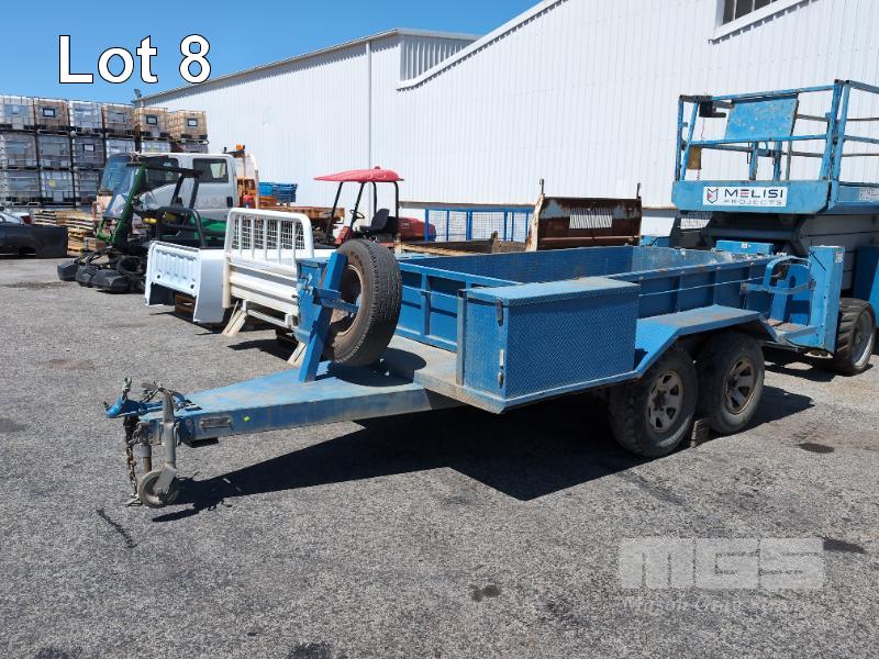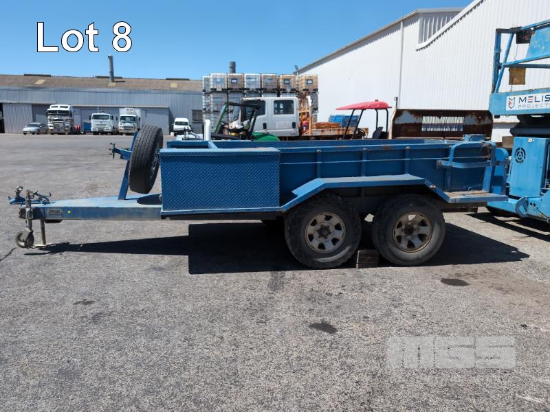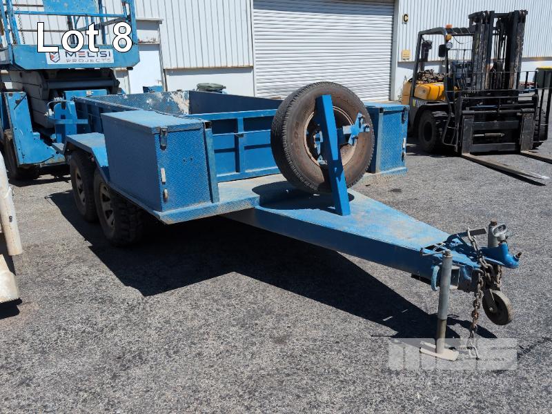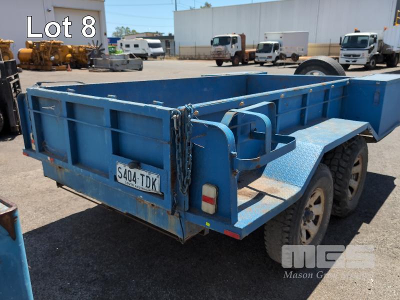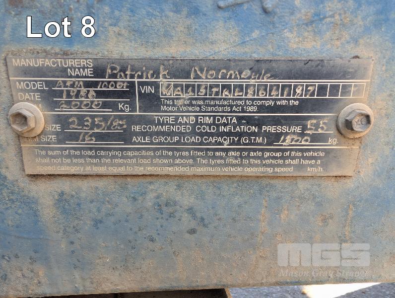 1986 PATRICK NORMOYLE 10x7' APPROX TANDEM AXLE PLANT TRAILER MODEL: ATM10001 REG: S404 TDK (SA) VIN / CHASSIS: VA1STRL864187 BALL HITCH BRAKES WINDING PROP STAND 2 x TOOL BOXES, 1100 x 400 x 550mm (L W H) APPROX HINGED TAILGATE REMOVABLE FRONT GATE DUAL SPARE WHEEL MOUNT, SPARE WHEEL GVM: 2000kg GTM: 1500kg