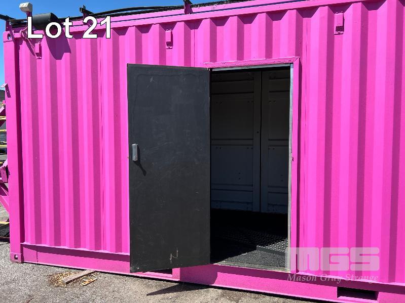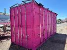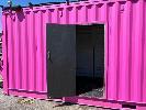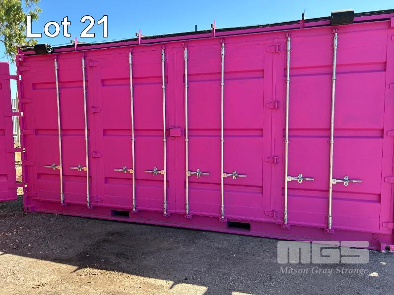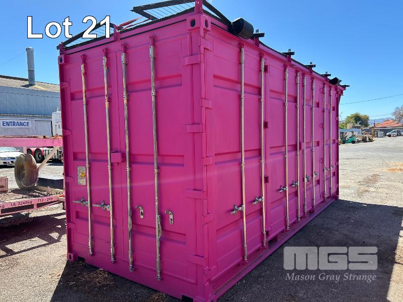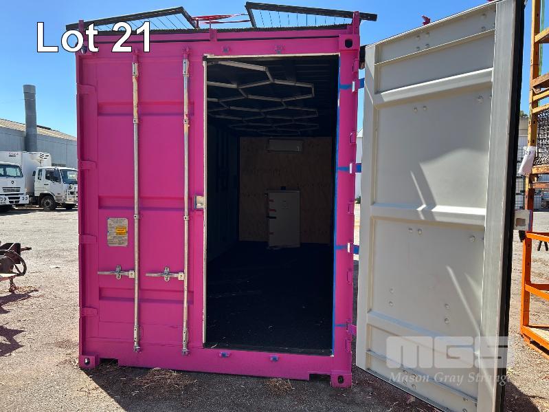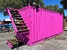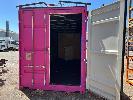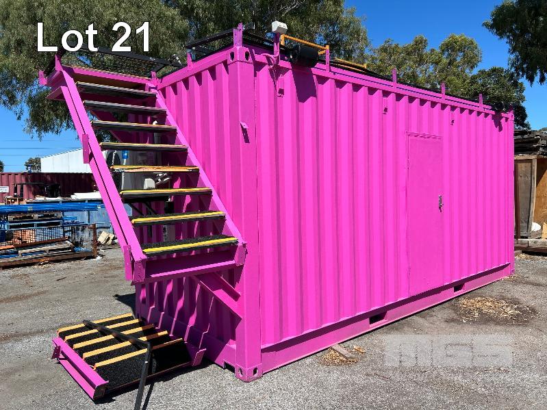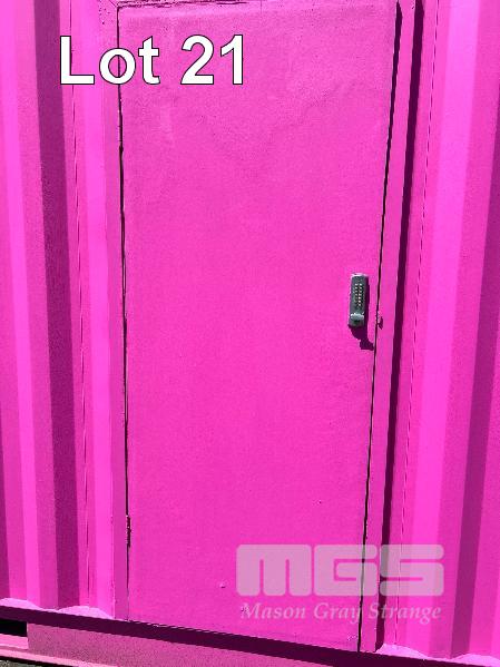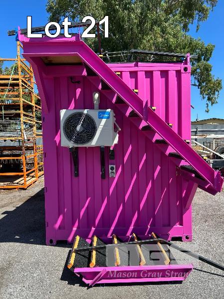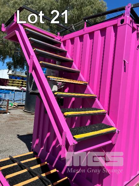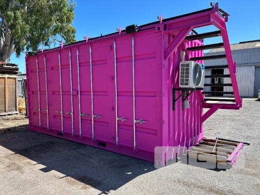 20 FT SHIPPING CONTAINER, PINK FITTED OUT WITH WITH TOP VEIWING PLATFORM INCORPERATING REMOVABLE HAND RAILS & END MOUNT STEEL STAIR CASE, 240V POWER FUSE BOX & GPO'S, LIGHTING, REVERSE CYCLE AIR CON. DOUBLE END DOORS, 4 x SIDE MOUT DOORS ON ONE SIDE & SINGLE ENTRY DOOR ON THE OTHER SIDE, WITH KEYPAD LOCK.