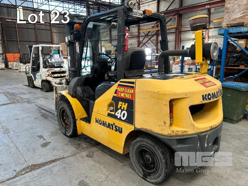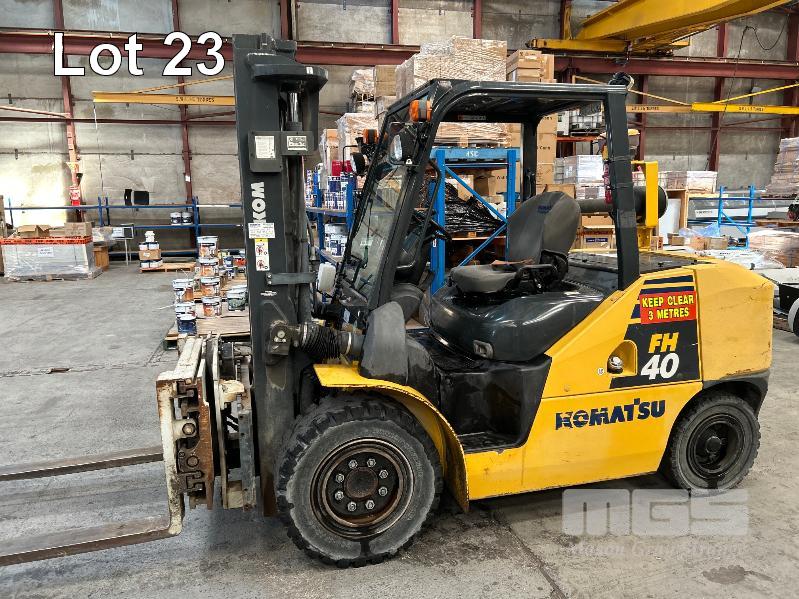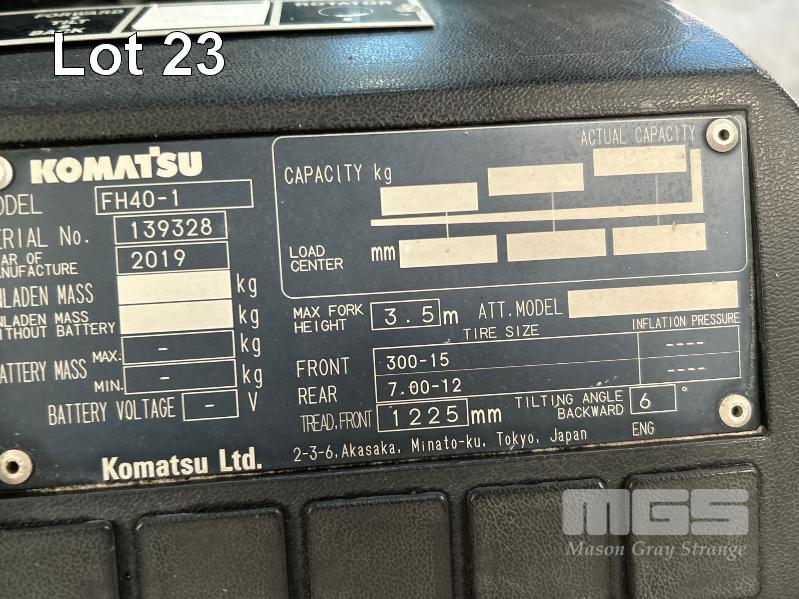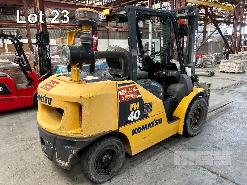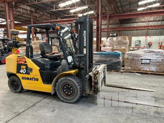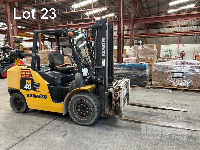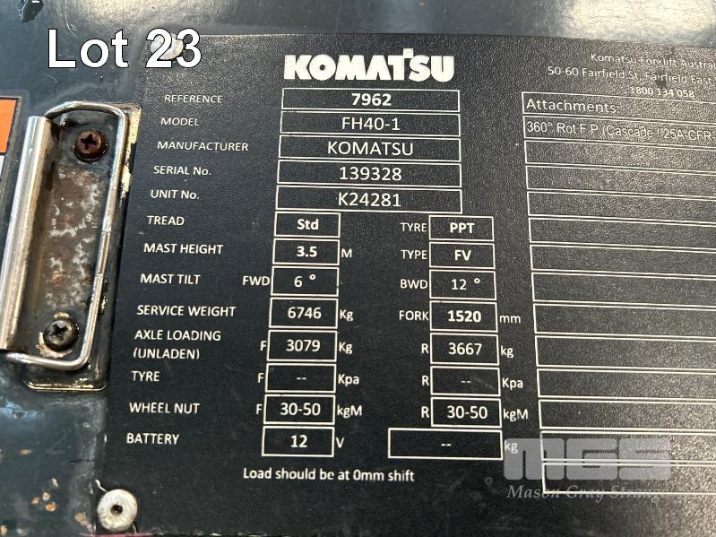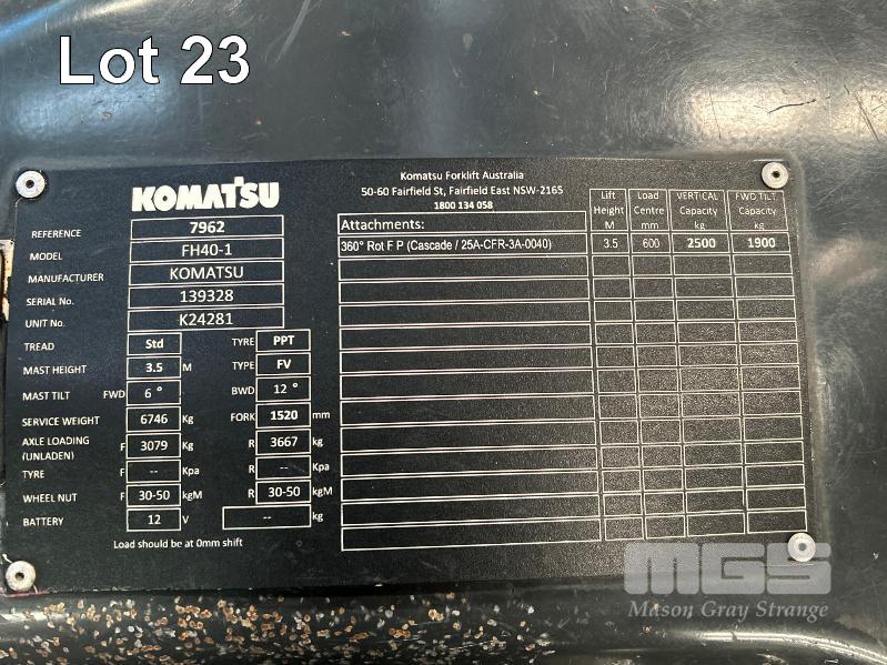 2019 KOMATSU FORKLIFT, 4 TONNE MOD: FD40-1 REG: S00 SHM (SA) S/NO: 139328 UNIT NO: K24281 MAX LIFT CAP: 2,500kg (WITH ROTATOR) FITTED WITH CASCADE 360 DEGREE ROTATOR ATTACHMENT MOD: 25A-CFR-3A-0040 MAX LIFT HEIGHT: 3500mm FORK TYNE SHIFT EXTRA WIDE 2 STAGE MAST 4 CYLINDER DIESEL ENGINE HOUR: 1,360 SHOWING FITTED WITH SAFETY MANAGEMENT SYSTEM SOLID TYRES, ACCU TILT FORK LEVEL INDICATOR 1 x KEY KEY #52