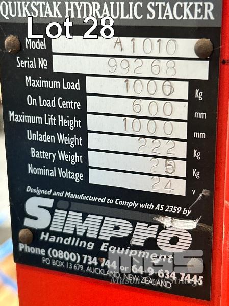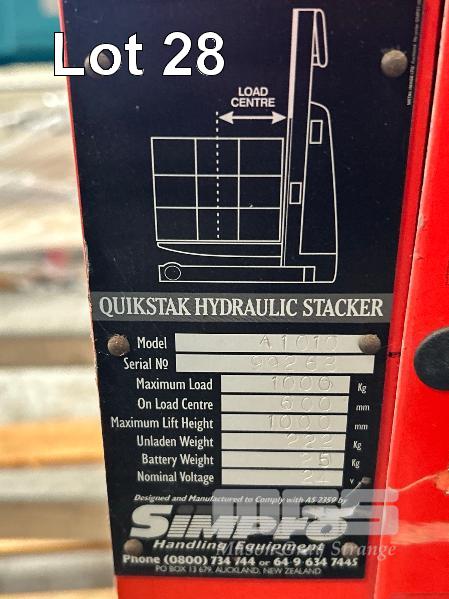 WALKIE STACKER PALLET FORK, ELECTRIC SIMPRO, QUICKSTAK SMART STACKER MODEL: A1010 MAX LIFT CAP. 1000kg MAX LIFT HEIGHT 1000mm